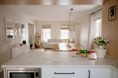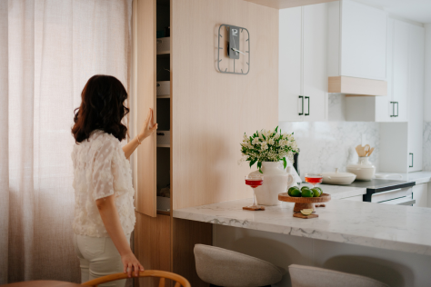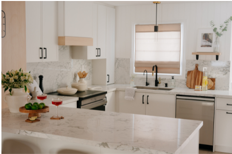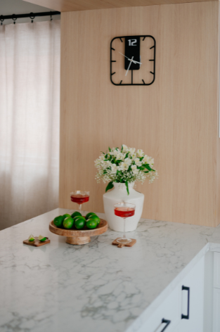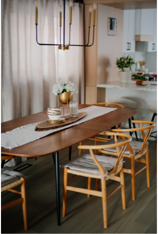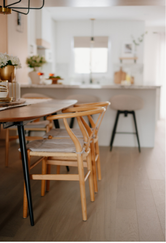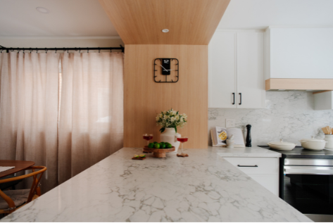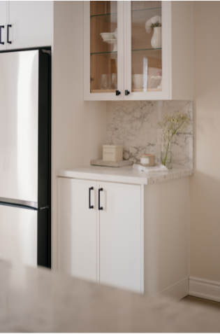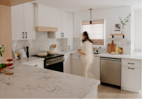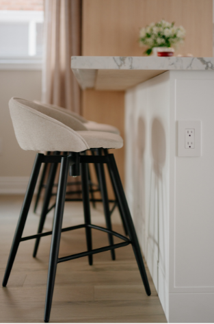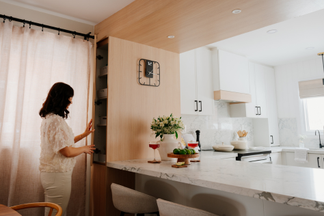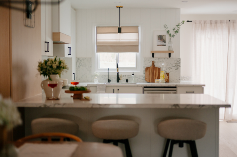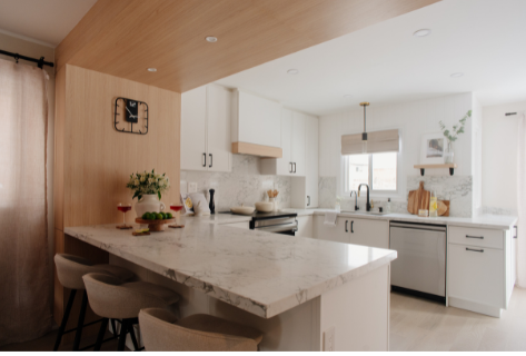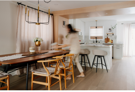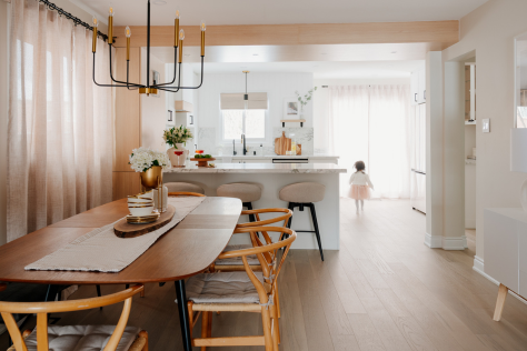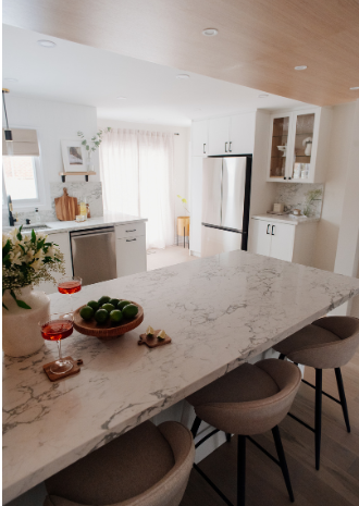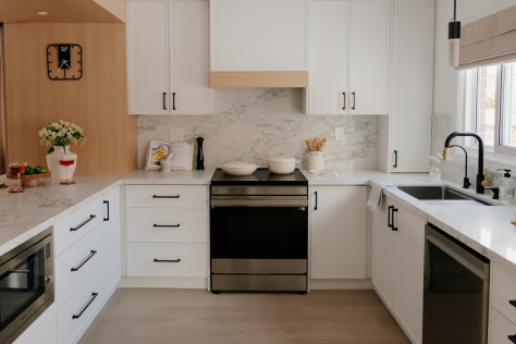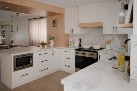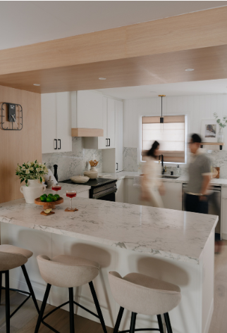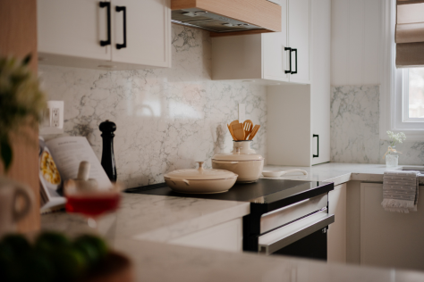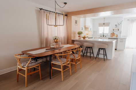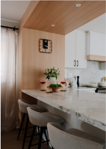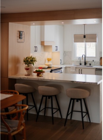 In 2024, Studiokimi Interior Design & Build completed a full renovation of a 2,800 sq.ft. home in Mississauga in just four weeks. The $150,000 project included a complete transformation of the kitchen, bathrooms, main floor, and second floor. A major structural change was made by removing the wall between the kitchen and dining room, opening up the space and allowing for a large custom island that perfectly fit the client’s lifestyle needs. The kitchen was designed with a modern farmhouse aesthetic, featuring a beautiful blend of crisp white cabinetry and natural oak accents. A stunning quartz countertop flows seamlessly into a continuous backsplash, adding elegance and durability. Shiplap panels on the wall add warmth and texture, tying together the farmhouse-inspired look.