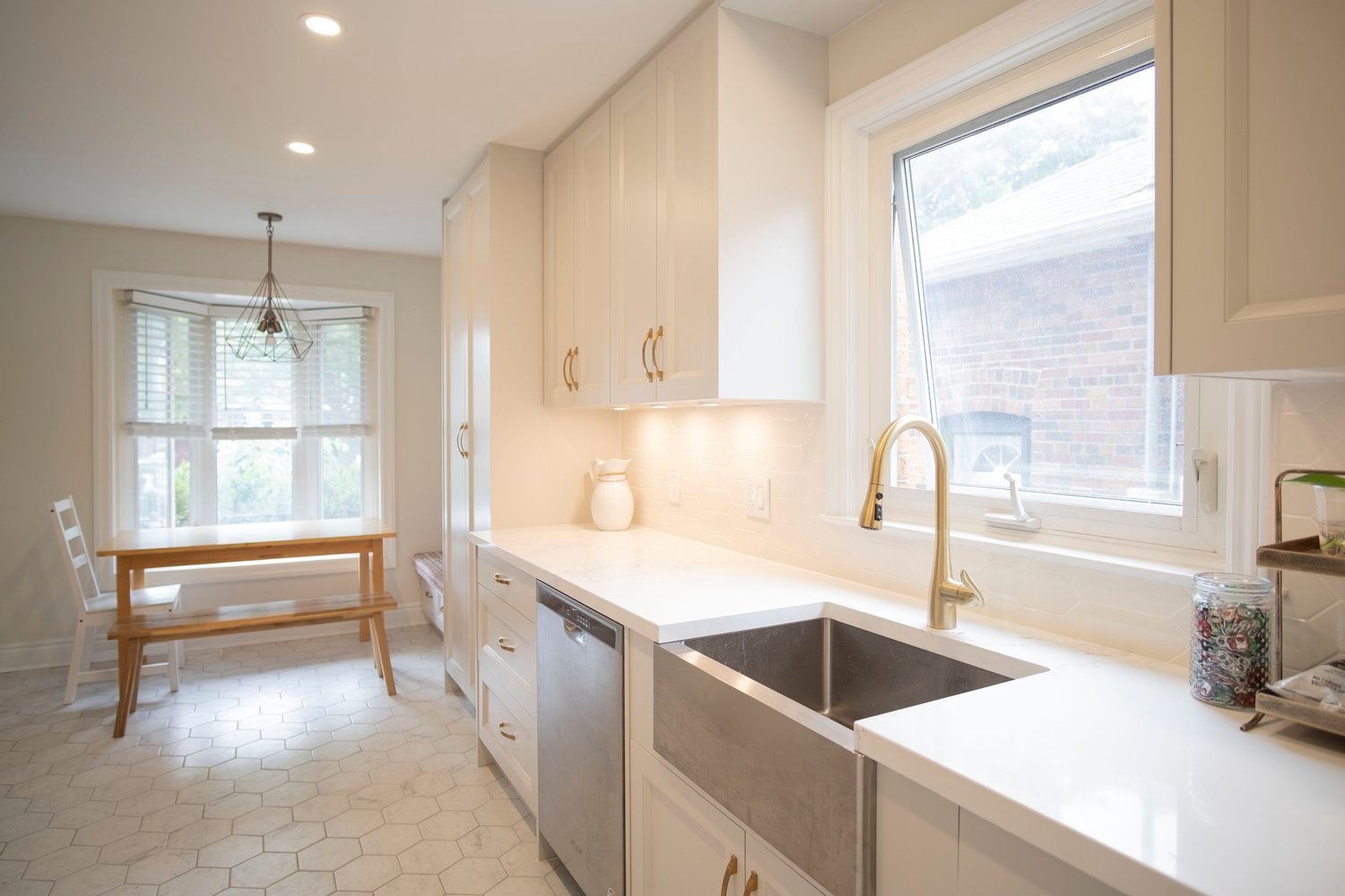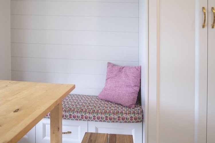 A transitional kitchen design crafted for a space under 500 square feet. Nestled within a cozy footprint, our team has successfully transformed this area into a bright and airy culinary haven. One of the standout features of this design is the custom bench seat, meticulously curated to elevate both style and functionality. A pop of vibrant color adds a playful touch, infusing the space with personality and charm. adding to the visual intrigue. the vertical shiplap board brings texture and depth to the walls, creating a dynamic backdrop that effortlessly ties together the design elements. This unique touch adds a touch of classic warmth while maintaining a contemporary appeal, perfectly aligning with the transitional theme. In this project, we’ve harmoniously blended form and function to create a kitchen that maximizes every inch of the space, providing a seamless transition between style aesthetics. The result is a captivating kitchen design that showcases how even a smaller area can radiate spaciousness, elegance, and individuality.