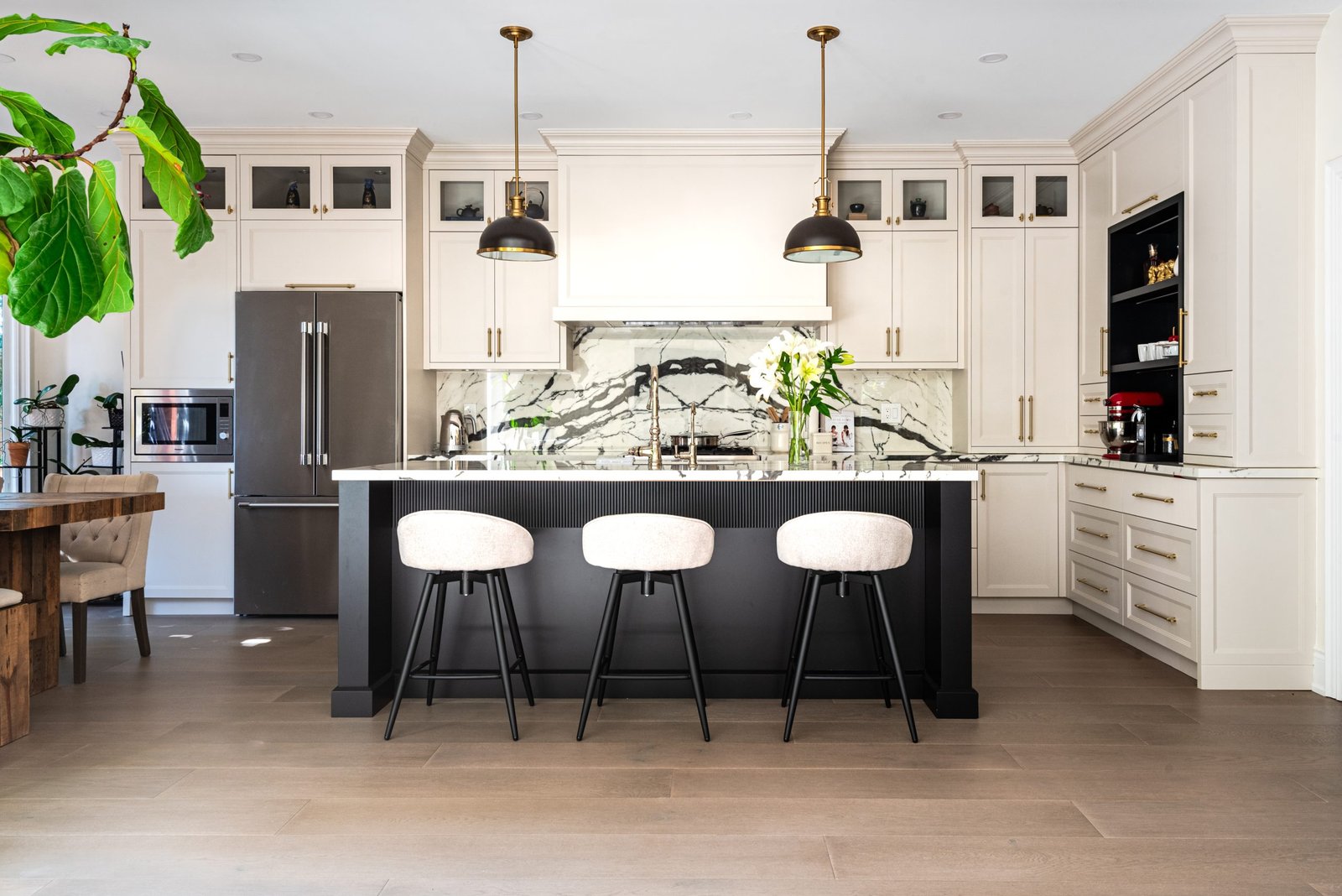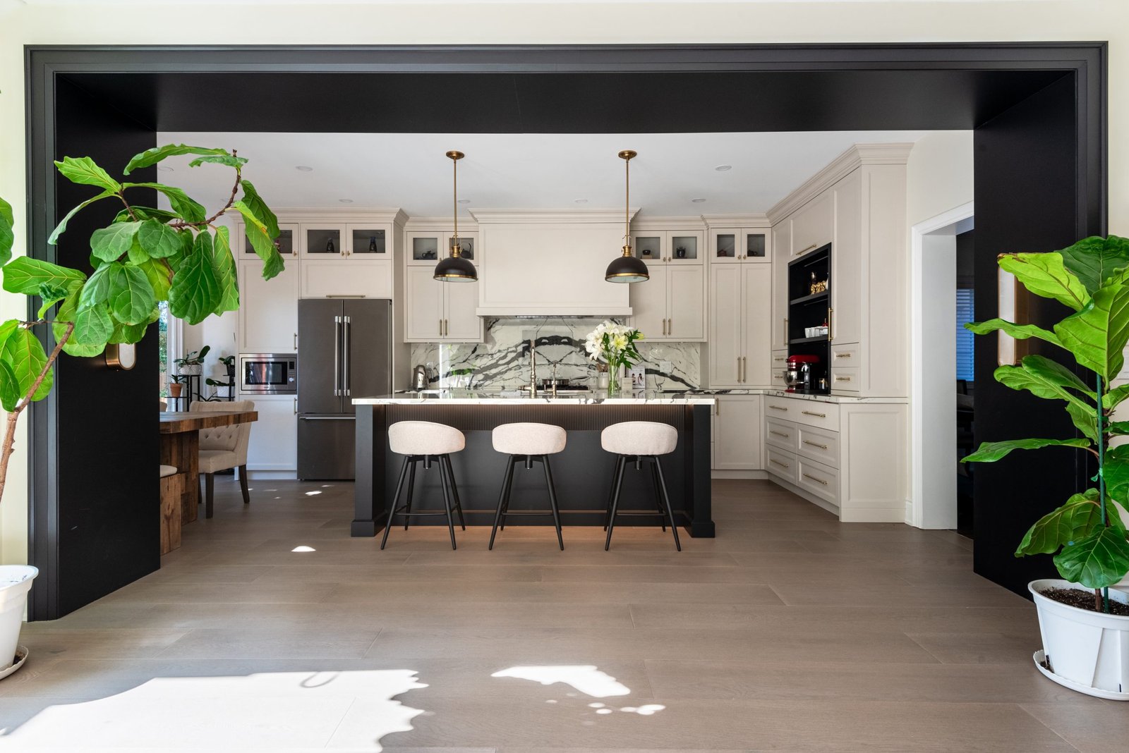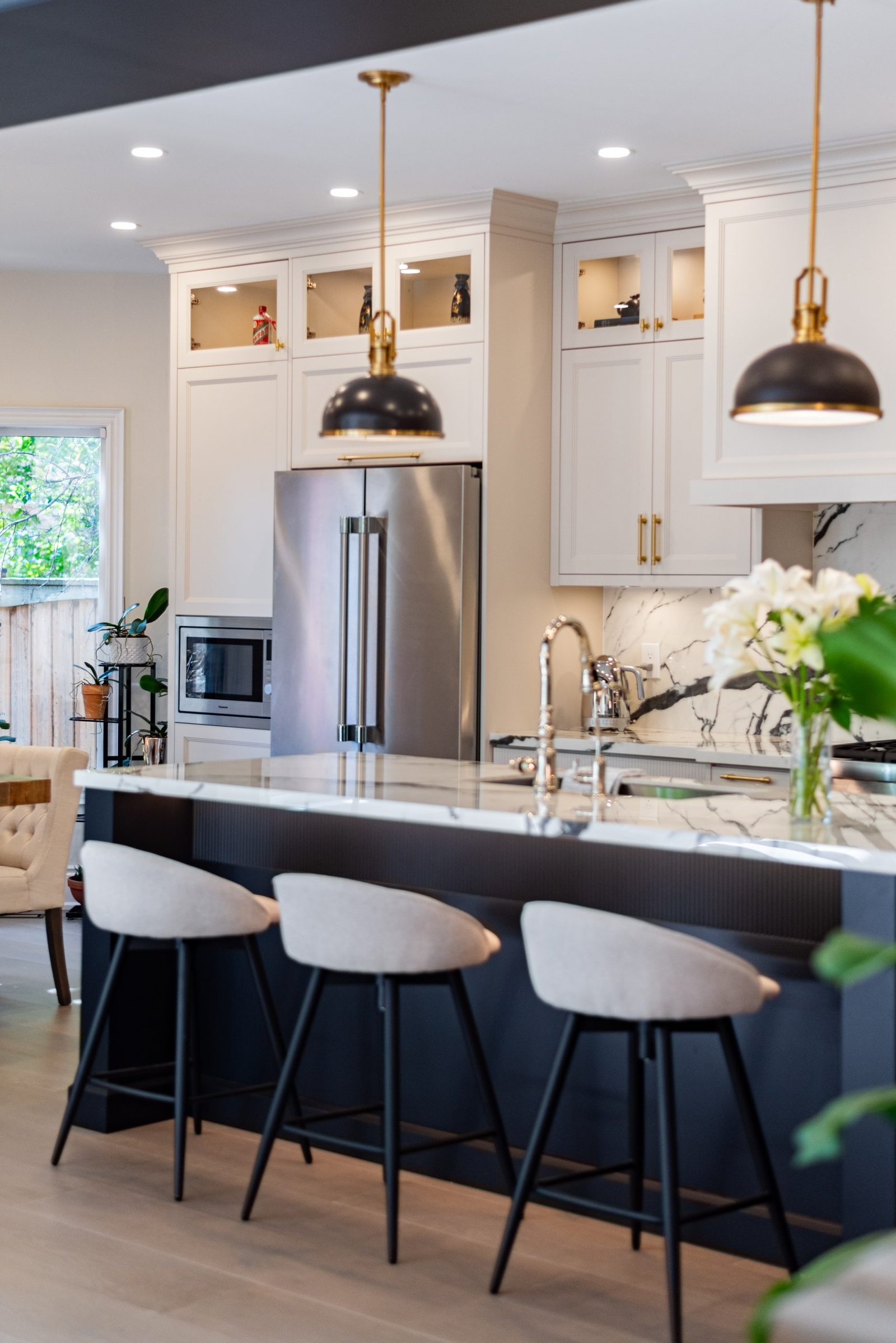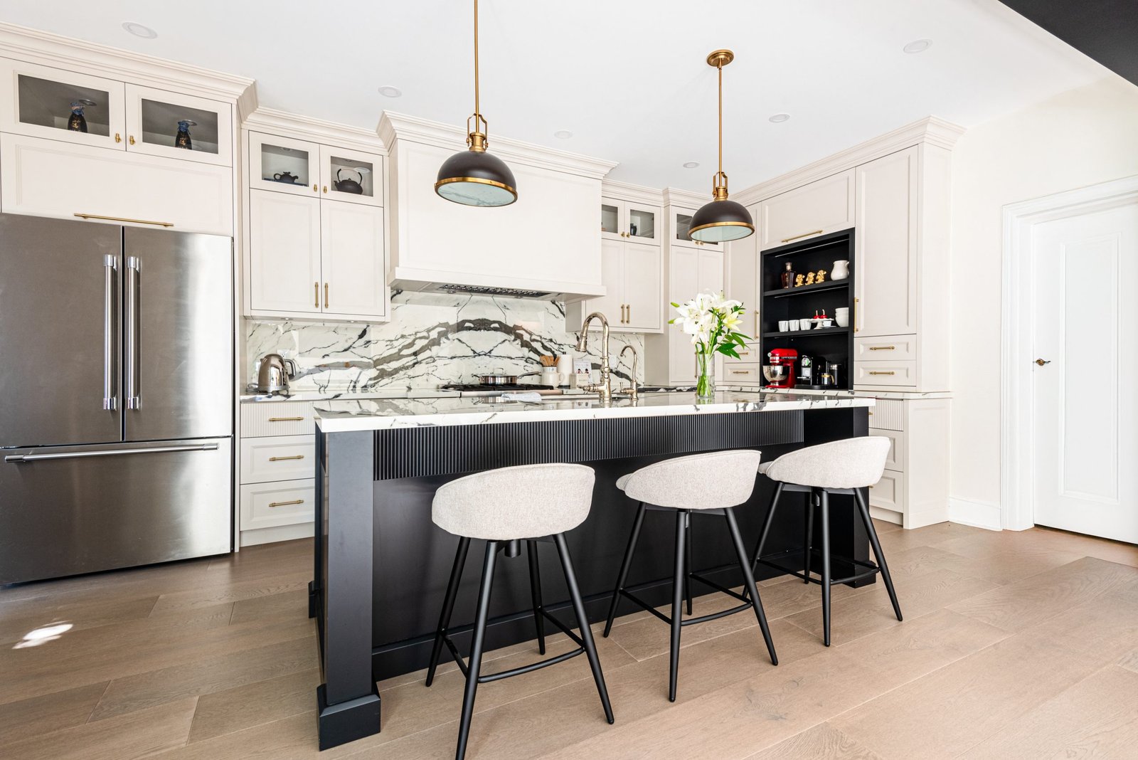 Nestled in the heart of a vibrant neighbourhood, this project showcases a bold and dramatic transformation for a young couple’s home. Encompassing a full-house renovation, we re-imagined the first and second floors, including the kitchen, dining area, two bathrooms, mudroom, laundry room, and staircase. The design, completed in just four weeks, cantered on striking contrasts, with dramatic interplay between light and dark tones creating a visually captivating aesthetic. With a construction period of eight weeks and a budget of $200,000, the result is a harmonious blend of functionality and bold design, perfectly tailored to the couple’s modern lifestyle. The kitchen underwent a transformative redesign, driven by the clients’ vision for an open concept layout that seamlessly connects the living and dining But the true showstopper of this custom house is the home theater, which features a split floor level and comfortable seating for the whole family. It’s the perfect spot for movie nights or for catching the big game. And when you need to relax and unwind, the large walk-out basement is the perfect spot. It’s the perfect place to set up a home gym or create a cozy den. Every detail of this custom house has been carefully considered and expertly executed, resulting in a truly one-of-a-kind home. We are incredibly proud of the work that our team at Studiokimi Interior Design & Build has done on this project and we can’t wait to see what the future holds for us. In the laundry room, we embraced functionality without compromising on style. The modern design maintains continuity with the home’s overarching aesthetic, while checkered flooring introduces a playful yet timeless element, turning a practical space into one filled with character and interest. The bathrooms received a complete reimagination, blending functionality with refined design touches. Careful attention was given to contrast, with thoughtfully chosen flooring and wall finishes creating a dynamic yet harmonious interplay. This design approach ensures that each bathroom feels refreshing and rejuvenating, offering a perfect retreat for our clients. Every space in this home reflects a balance between practicality and bespoke design, capturing our clients’ unique vision while ensuring seamless transitions throughout.