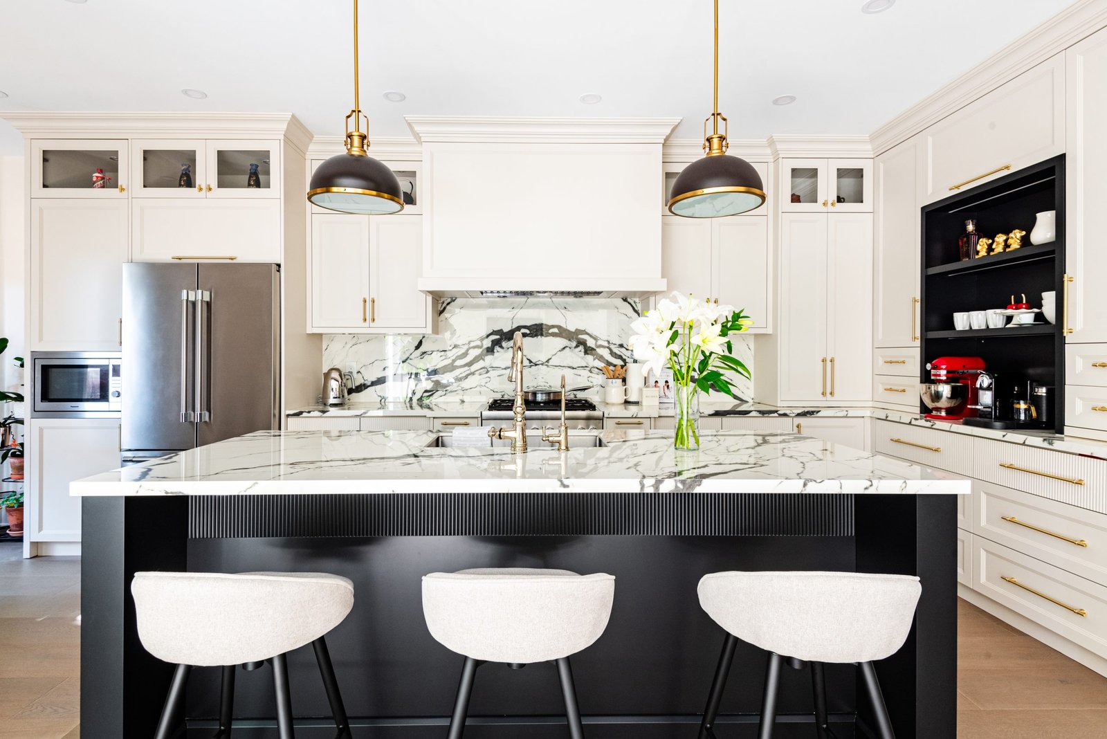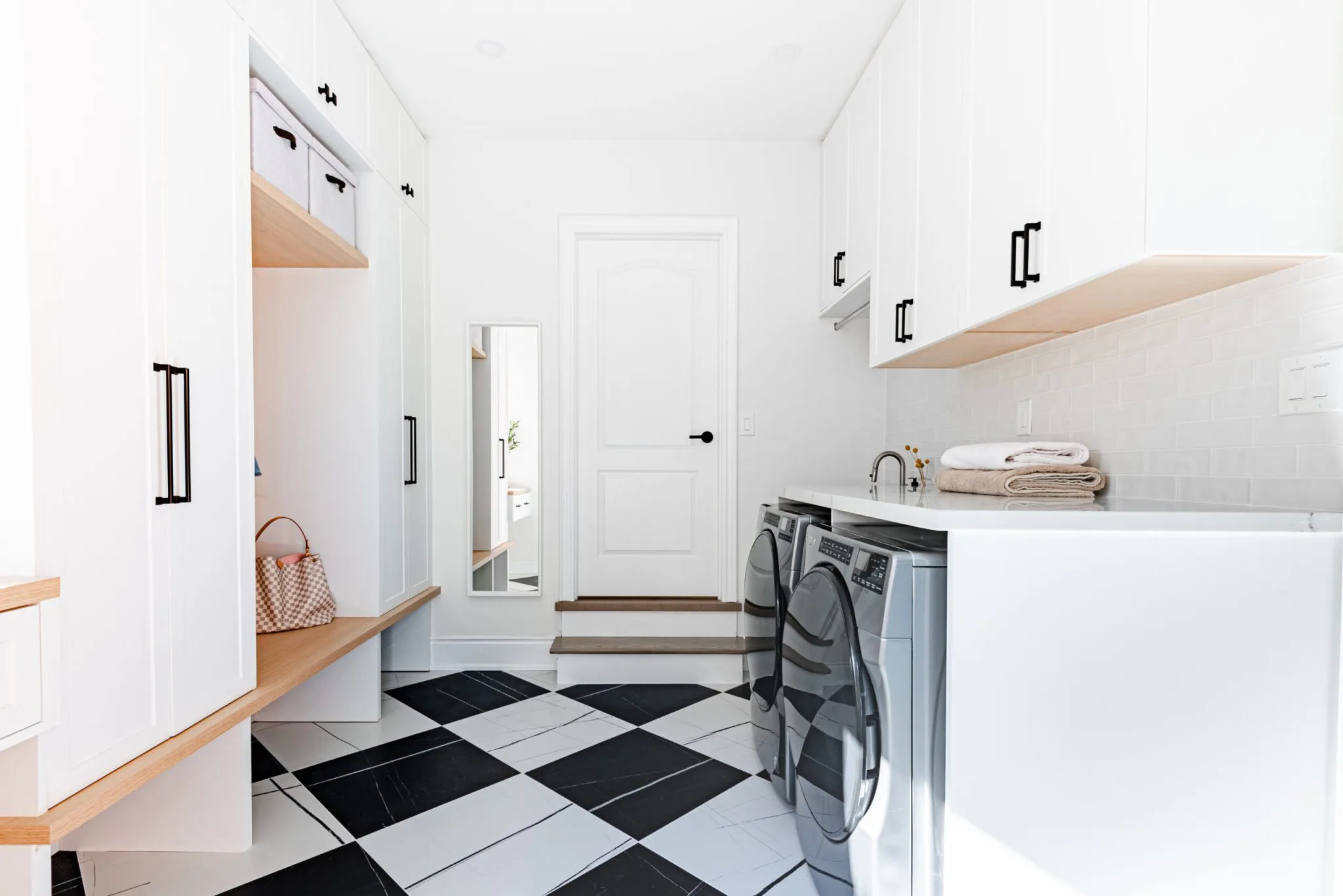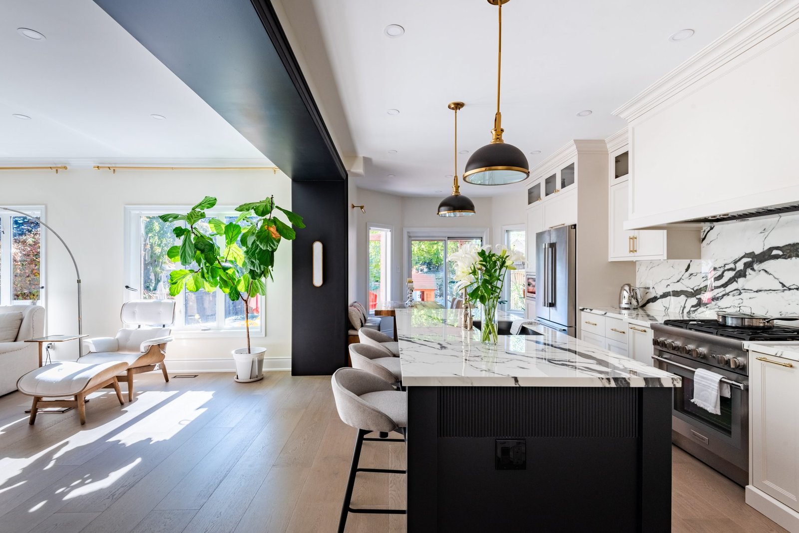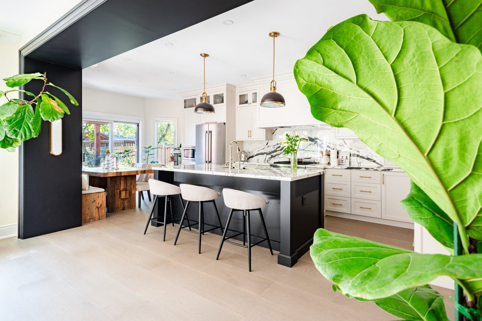 Nestled in the heart of a vibrant neighbourhood, this project showcases a bold and dramatic transformation for a young couple’s home. Encompassing a full-house renovation, we re-imagined the first and second floors, including the kitchen, dining area, two bathrooms, mudroom, laundry room, and staircase. The design, completed in just four weeks, cantered on striking contrasts, with dramatic interplay between light and dark tones creating a visually captivating aesthetic. With a construction period of eight weeks and a budget of $200,000, the result is a harmonious blend of functionality and bold design, perfectly tailored to the couple’s modern lifestyle. The kitchen underwent a transformative redesign, driven by the clients’ vision for an open concept layout that seamlessly connects the living and dining But the true showstopper of this custom house is the home theater, which features a split floor level and comfortable seating for the whole family. It’s the perfect spot for movie nights or for catching the big game. And when you need to relax and unwind, the large walk-out basement is the perfect spot. It’s the perfect place to set up a home gym or create a cozy den. Every detail of this custom house has been carefully considered and expertly executed, resulting in a truly one-of-a-kind home. We are incredibly proud of the work that our team at Studiokimi Interior Design & Build has done on this project and we can’t wait to see what the future holds for us. In the laundry room, we embraced functionality without compromising on style. The modern design maintains continuity with the home’s overarching aesthetic, while checkered flooring introduces a playful yet timeless element, turning a practical space into one filled with character and interest. The bathrooms received a complete reimagination, blending functionality with refined design touches. Careful attention was given to contrast, with thoughtfully chosen flooring and wall finishes creating a dynamic yet harmonious interplay. This design approach ensures that each bathroom feels refreshing and rejuvenating, offering a perfect retreat for our clients. Every space in this home reflects a balance between practicality and bespoke design, capturing our clients’ unique vision while ensuring seamless transitions throughout.
