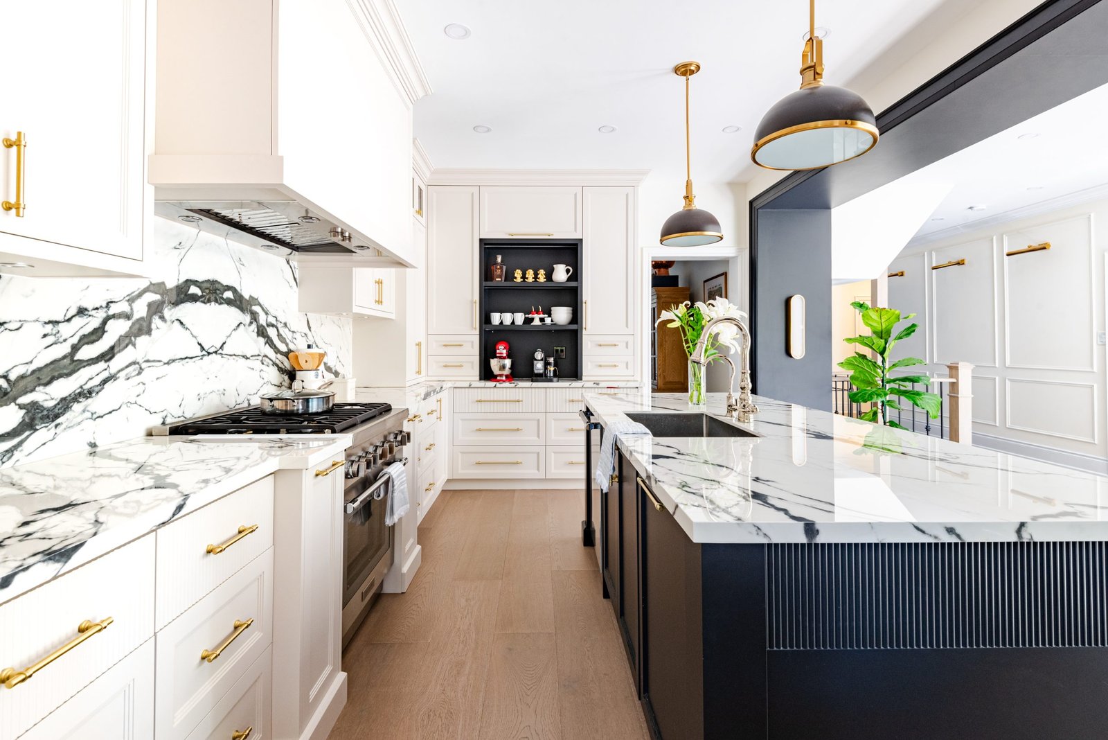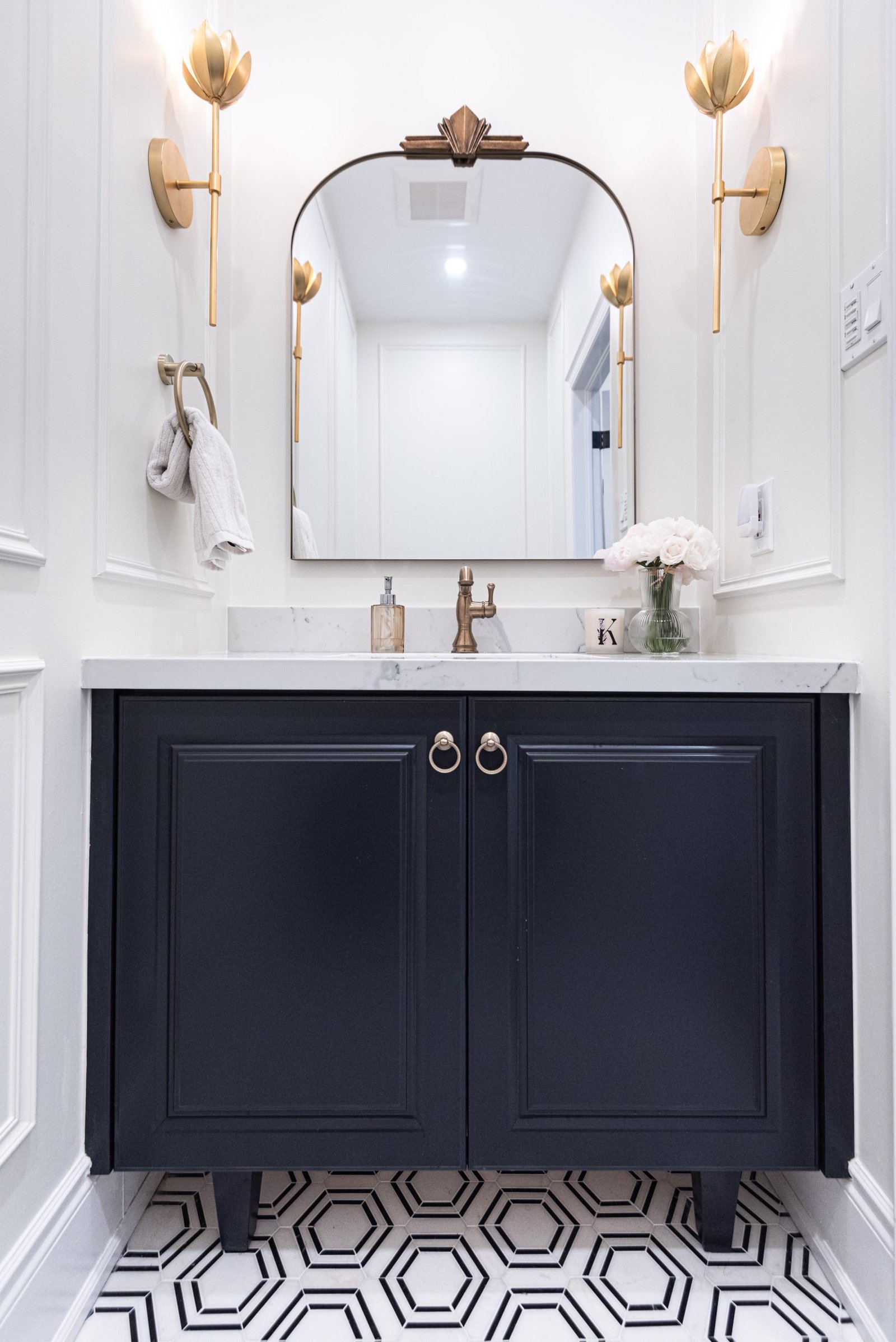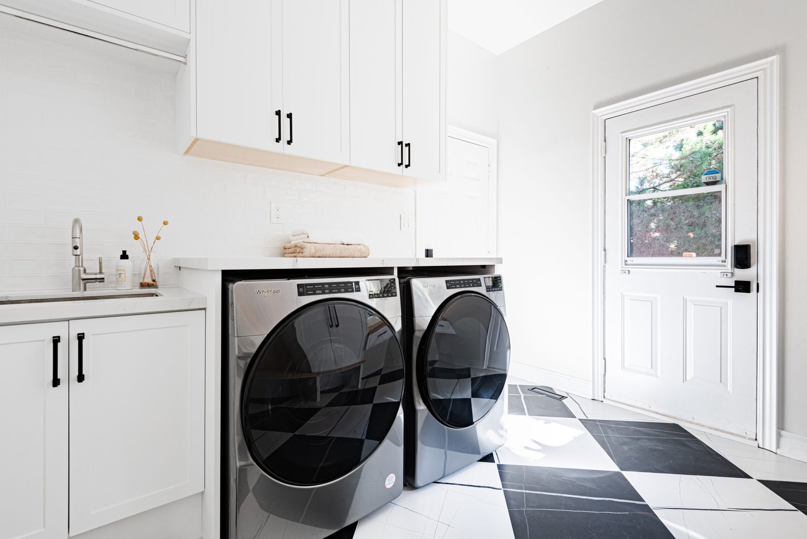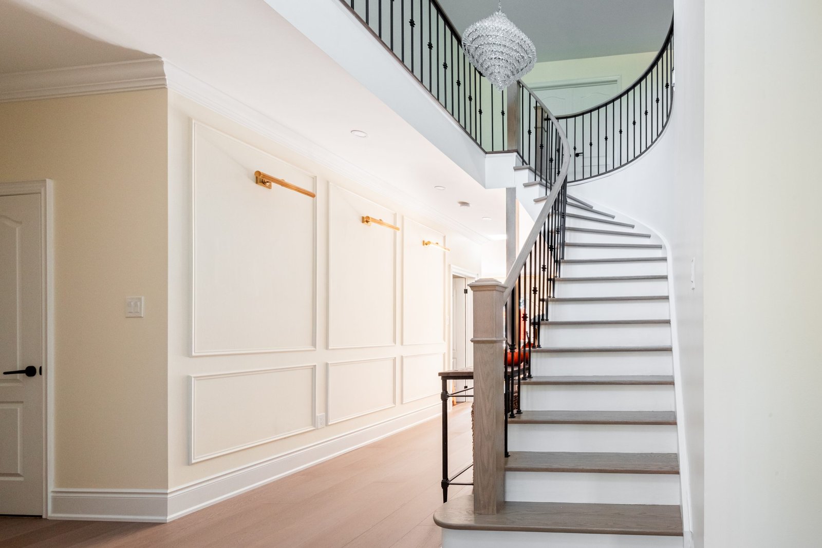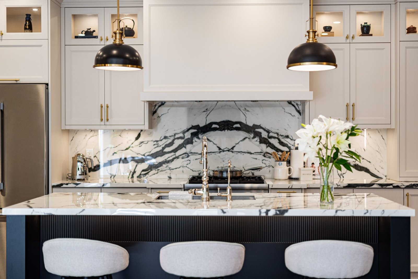 Nestled in the heart of a vibrant neighbourhood, this project showcases a bold and dramatic transformation for a young couple’s home. Encompassing a full-house renovation, we re-imagined the first and second floors, including the kitchen, dining area, two bathrooms, mudroom, laundry room, and staircase. The design, completed in just four weeks, cantered on striking contrasts, with dramatic interplay between light and dark tones creating a visually captivating aesthetic. With a construction period of eight weeks and a budget of $200,000, the result is a harmonious blend of functionality and bold design, perfectly tailored to the couple’s modern lifestyle. The kitchen underwent a transformative redesign, driven by the clients’ vision for an open concept layout that seamlessly connects the living and dining But the true showstopper of this custom house is the home theater, which features a split floor level and comfortable seating for the whole family. It’s the perfect spot for movie nights or for catching the big game. And when you need to relax and unwind, the large walk-out basement is the perfect spot. It’s the perfect place to set up a home gym or create a cozy den. Every detail of this custom house has been carefully considered and expertly executed, resulting in a truly one-of-a-kind home. We are incredibly proud of the work that our team at Studiokimi Interior Design & Build has done on this project and we can’t wait to see what the future holds for us. In the laundry room, we embraced functionality without compromising on style. The modern design maintains continuity with the home’s overarching aesthetic, while checkered flooring introduces a playful yet timeless element, turning a practical space into one filled with character and interest. The bathrooms received a complete reimagination, blending functionality with refined design touches. Careful attention was given to contrast, with thoughtfully chosen flooring and wall finishes creating a dynamic yet harmonious interplay. This design approach ensures that each bathroom feels refreshing and rejuvenating, offering a perfect retreat for our clients. Every space in this home reflects a balance between practicality and bespoke design, capturing our clients’ unique vision while ensuring seamless transitions throughout.