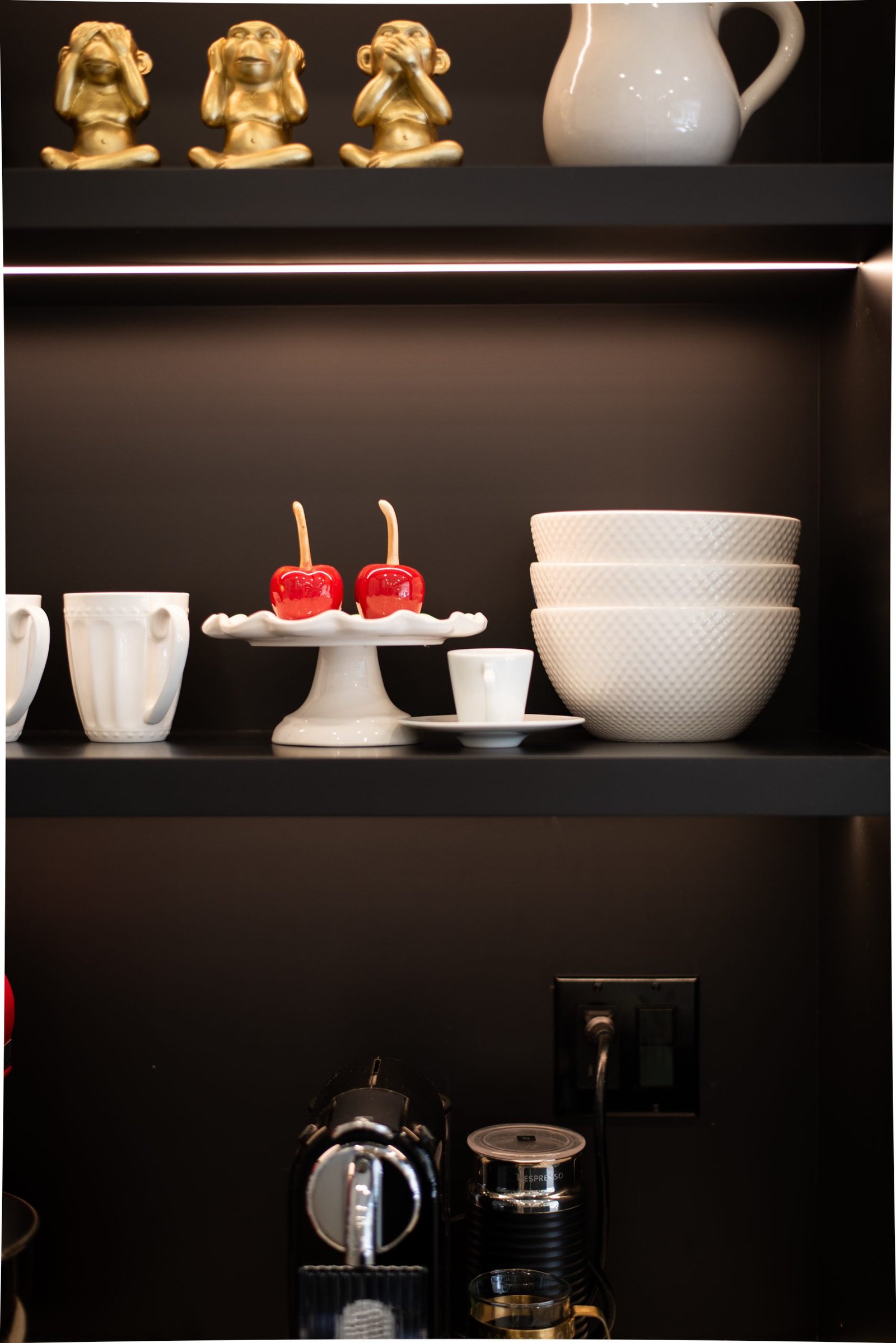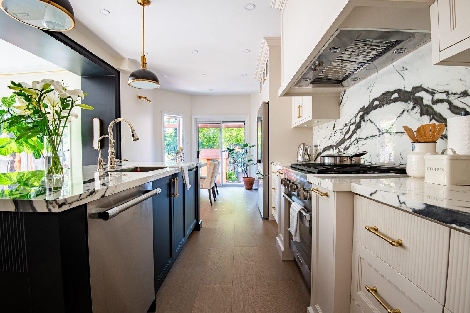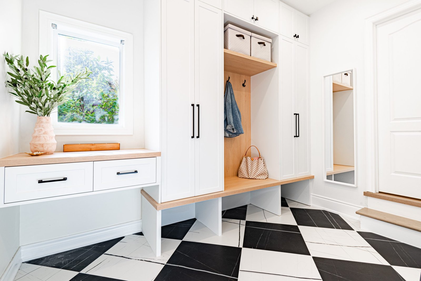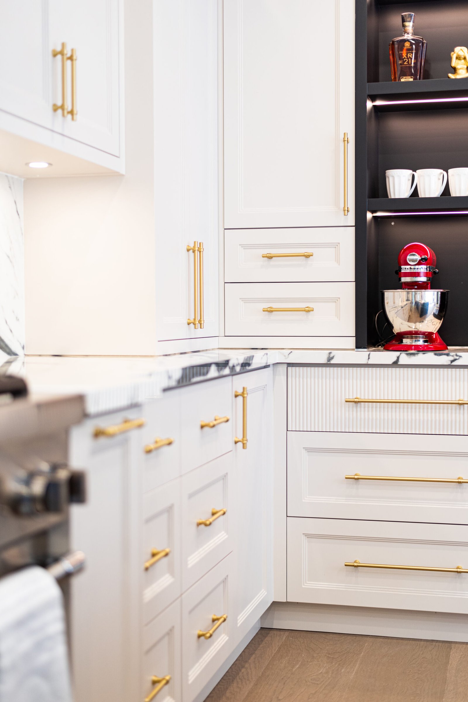 Nestled in the heart of a vibrant neighbourhood, this project showcases a bold and dramatic transformation for a young couple’s home. Encompassing a full-house renovation, we re-imagined the first and second floors, including the kitchen, dining area, two bathrooms, mudroom, laundry room, and staircase. The design, completed in just four weeks, cantered on striking contrasts, with dramatic interplay between light and dark tones creating a visually captivating aesthetic. With a construction period of eight weeks and a budget of $200,000, the result is a harmonious blend of functionality and bold design, perfectly tailored to the couple’s modern lifestyle. The kitchen underwent a transformative redesign, driven by the clients’ vision for an open concept layout that seamlessly connects the living and dining But the true showstopper of this custom house is the home theater, which features a split floor level and comfortable seating for the whole family. It’s the perfect spot for movie nights or for catching the big game. And when you need to relax and unwind, the large walk-out basement is the perfect spot. It’s the perfect place to set up a home gym or create a cozy den. Every detail of this custom house has been carefully considered and expertly executed, resulting in a truly one-of-a-kind home. We are incredibly proud of the work that our team at Studiokimi Interior Design & Build has done on this project and we can’t wait to see what the future holds for us. In the laundry room, we embraced functionality without compromising on style. The modern design maintains continuity with the home’s overarching aesthetic, while checkered flooring introduces a playful yet timeless element, turning a practical space into one filled with character and interest. The bathrooms received a complete reimagination, blending functionality with refined design touches. Careful attention was given to contrast, with thoughtfully chosen flooring and wall finishes creating a dynamic yet harmonious interplay. This design approach ensures that each bathroom feels refreshing and rejuvenating, offering a perfect retreat for our clients. Every space in this home reflects a balance between practicality and bespoke design, capturing our clients’ unique vision while ensuring seamless transitions throughout.