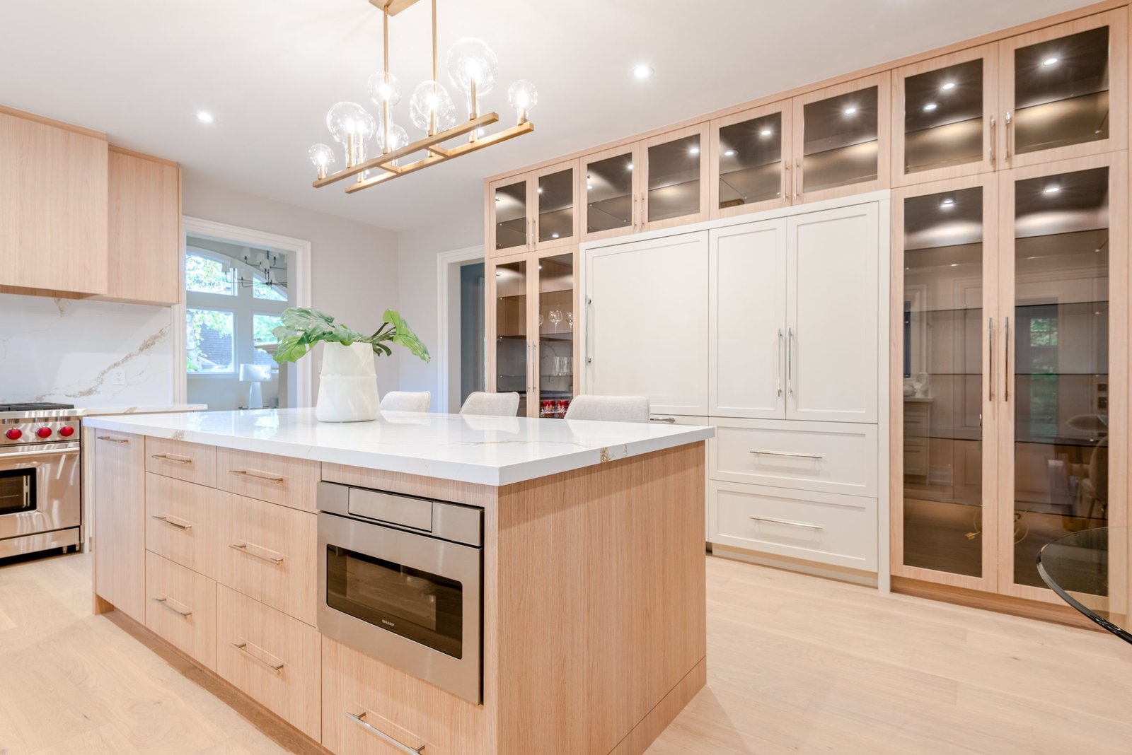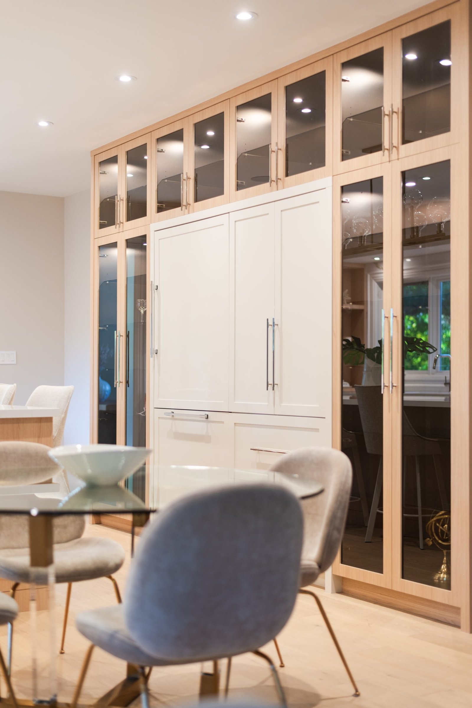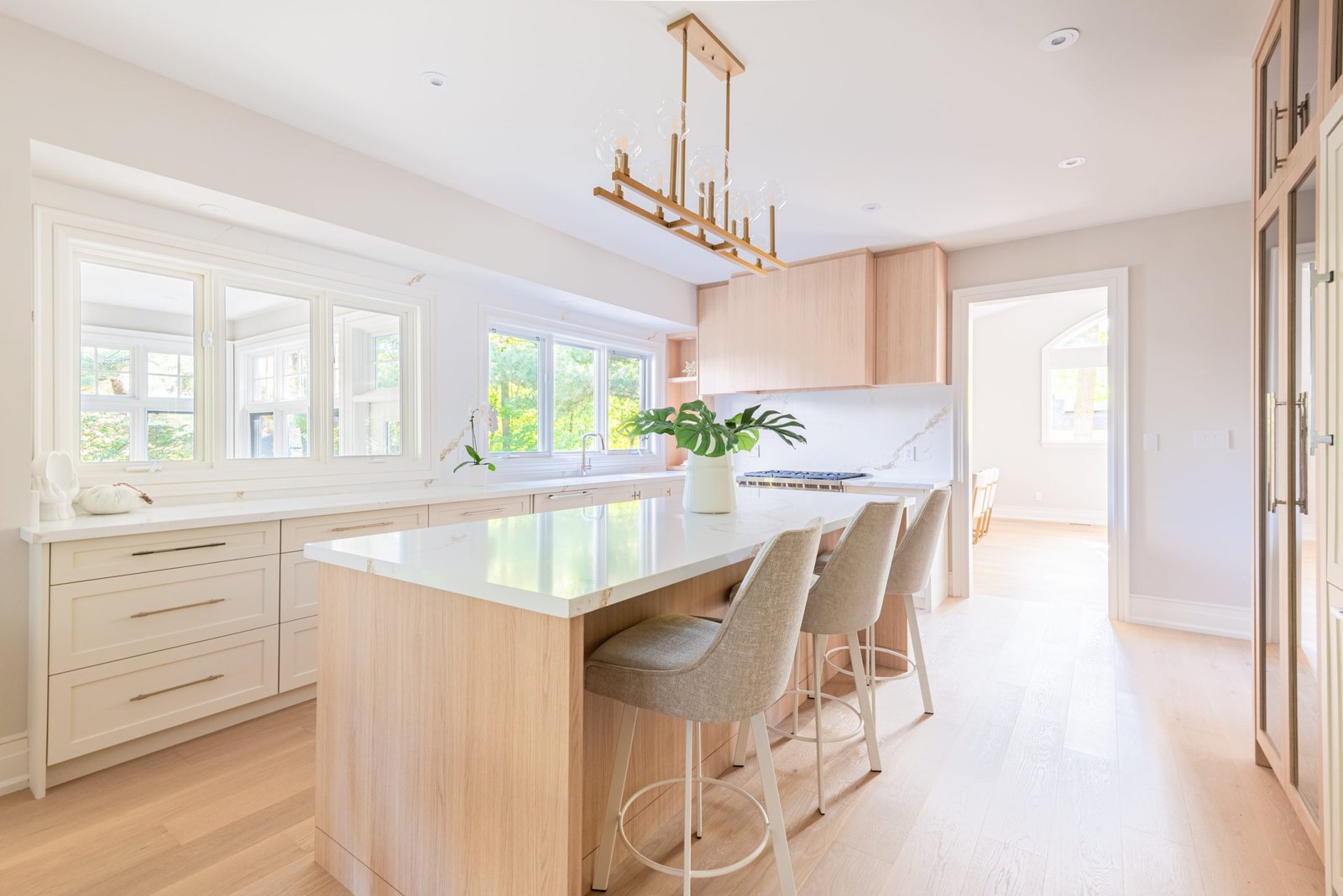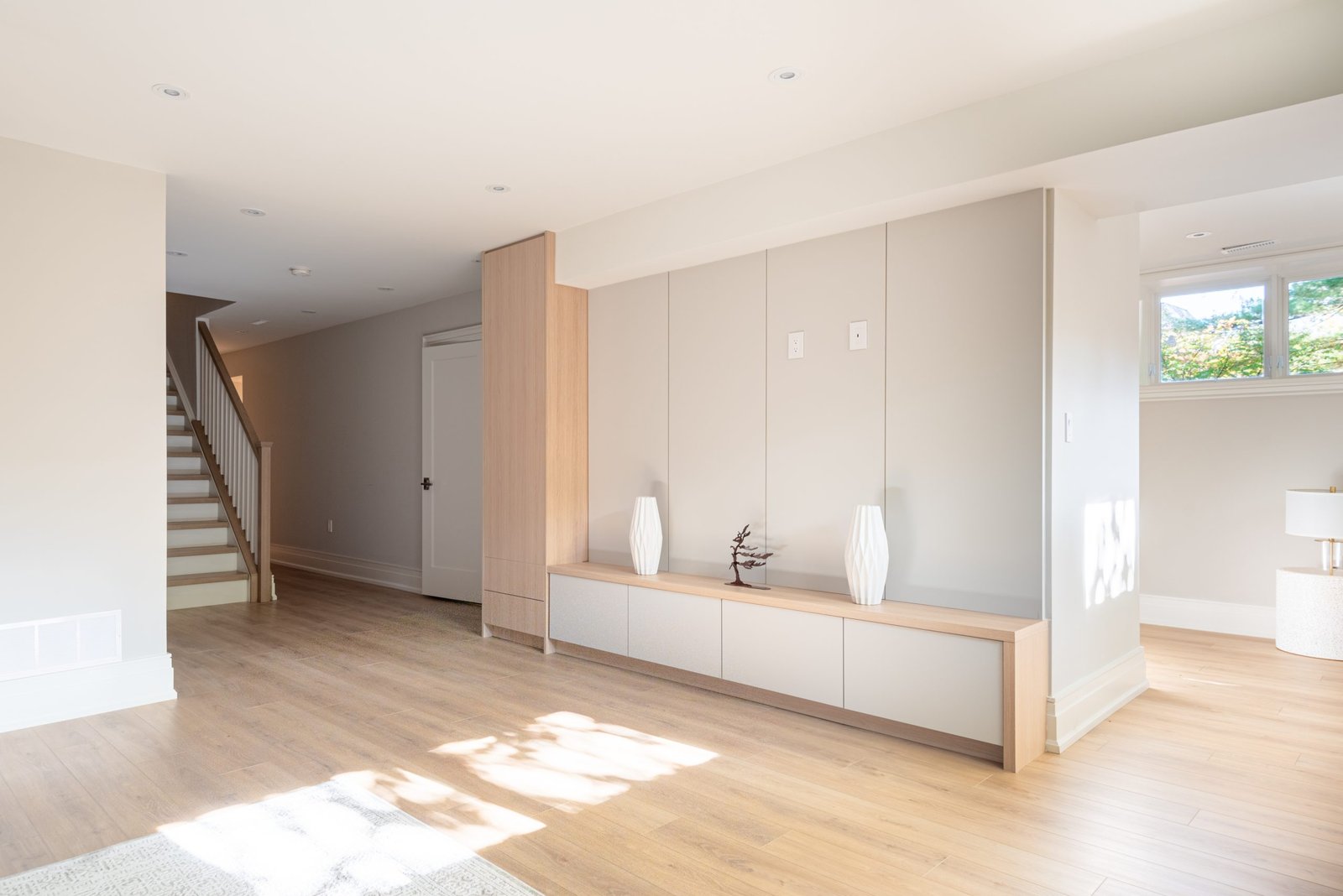 Nestled in the pristine streets of South Oakville, our recent project is a testament to transformative design. With a focus on tailored living, we embarked on a comprehensive modification of the floor plan, starting with the main floor. The kitchen and bathrooms underwent a radical redesign, featuring a warm and clean palette of light oak and off-white tones. Noteworthy details include smoked glass on tall cabinets, introducing subtle sophistication. featuring a warm and clean palette of light oak and off-white tones. Noteworthy details include smoked glass on tall cabinets, introducing subtle sophistication. An open-concept vision came to life as we seamlessly removed walls between the kitchen and family room, creating a harmonious living space. The second floor was strategically reconfigured, sacrificing a bedroom to accommodate a luxurious ensuite bathroom, meeting our client’s specific desires. This level now boasts three bedrooms, two ensuite bathrooms, and a thoughtfully crafted main bathroom. In the basement, we envisioned an entertainment area, offering our clients a dedicated space for memorable movie nights. This project reaffirms our belief that design should adapt to individuals, not the other way around. Tailoring each space to the unique needs and desires of our clients, this transitional house embodies a perfect blend of aesthetics and functionality, resulting in a residence that feels like a personalized sanctuary.