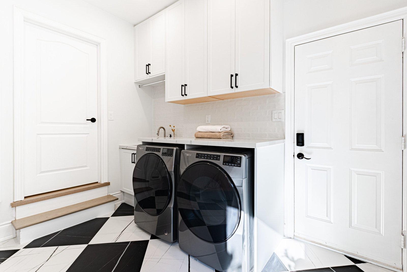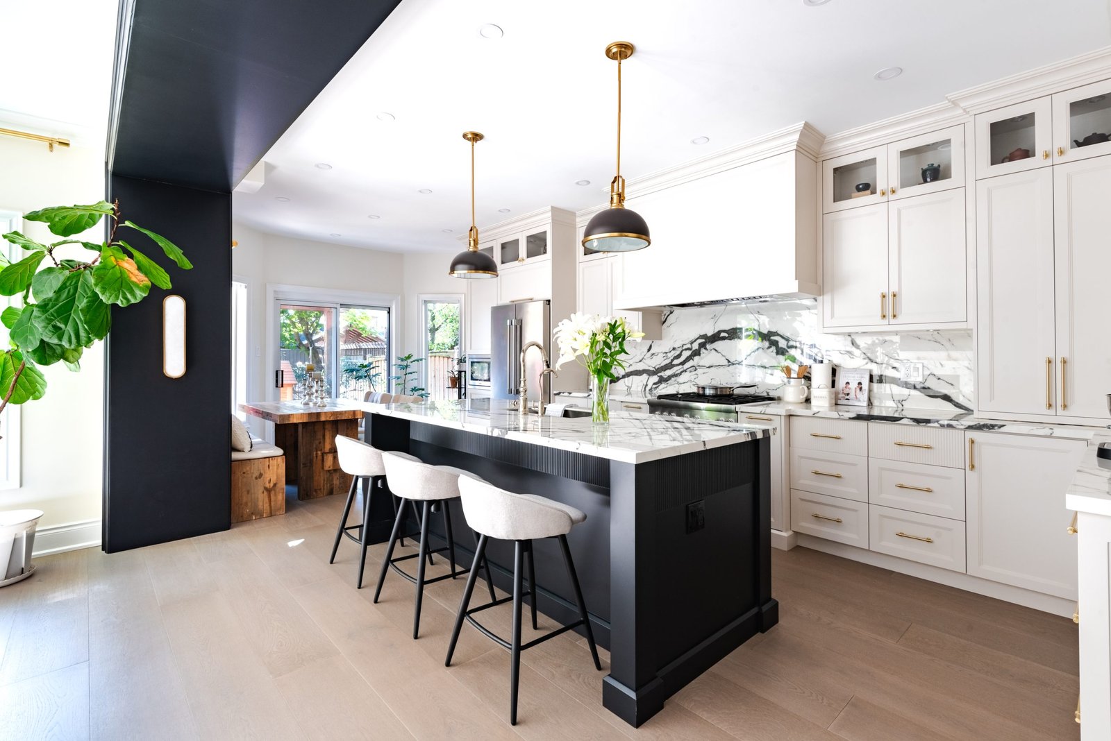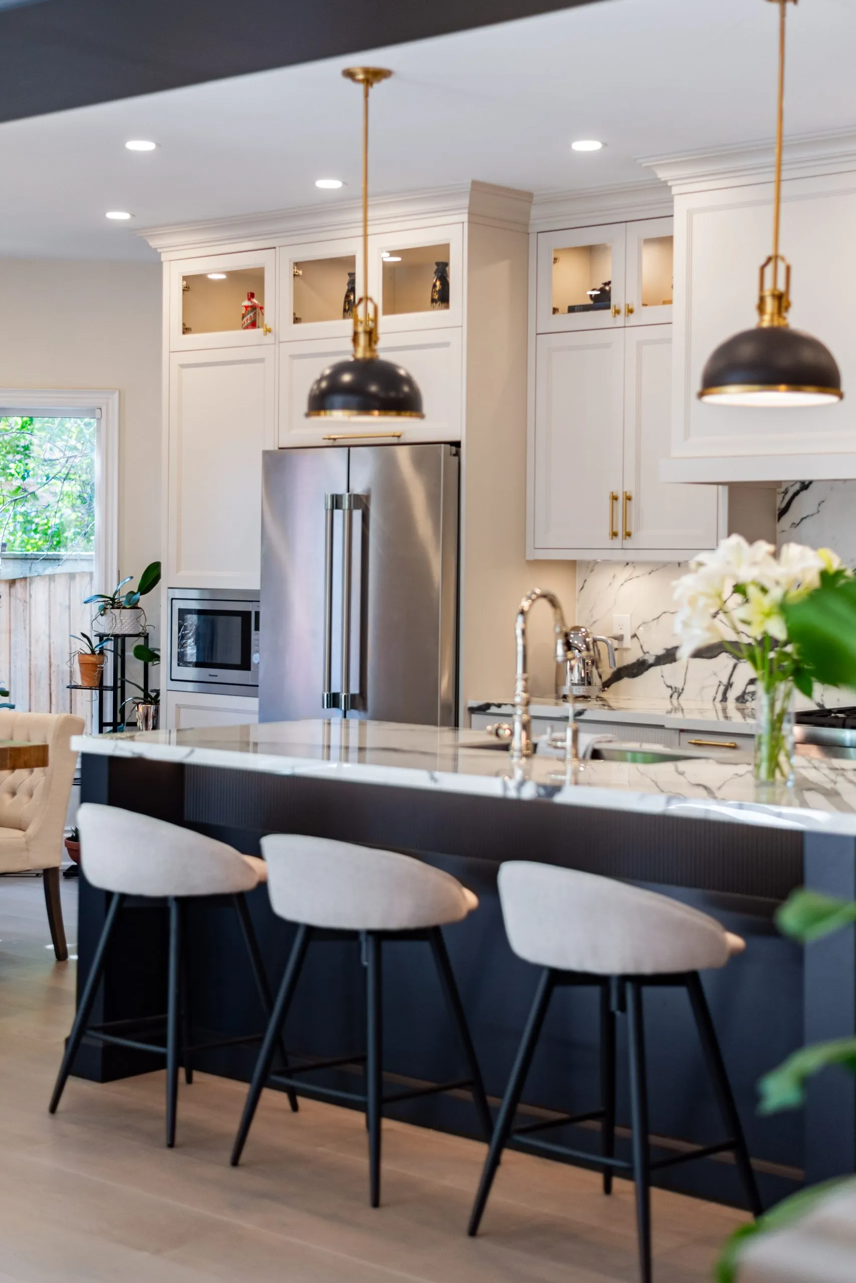 Nestled in the heart of a vibrant neighbourhood, this project showcases a bold and dramatic transformation for a young couple’s home. Encompassing a full-house renovation, we re-imagined the first and second floors, including the kitchen, dining area, two bathrooms, mudroom, laundry room, and staircase. The design, completed in just four weeks, cantered on striking contrasts, with dramatic interplay between light and dark tones creating a visually captivating aesthetic. With a construction period of eight weeks and a budget of $200,000, the result is a harmonious blend of functionality and bold design, perfectly tailored to the couple’s modern lifestyle. The kitchen underwent a transformative redesign, driven by the clients’ vision for an open concept layout that seamlessly connects the living and dining But the true showstopper of this custom house is the home theater, which features a split floor level and comfortable seating for the whole family. It’s the perfect spot for movie nights or for catching the big game. And when you need to relax and unwind, the large walk-out basement is the perfect spot. It’s the perfect place to set up a home gym or create a cozy den. Every detail of this custom house has been carefully considered and expertly executed, resulting in a truly one-of-a-kind home. We are incredibly proud of the work that our team at Studiokimi Interior Design & Build has done on this project and we can’t wait to see what the future holds for us. In the laundry room, we embraced functionality without compromising on style. The modern design maintains continuity with the home’s overarching aesthetic, while checkered flooring introduces a playful yet timeless element, turning a practical space into one filled with character and interest. The bathrooms received a complete reimagination, blending functionality with refined design touches. Careful attention was given to contrast, with thoughtfully chosen flooring and wall finishes creating a dynamic yet harmonious interplay. This design approach ensures that each bathroom feels refreshing and rejuvenating, offering a perfect retreat for our clients. Every space in this home reflects a balance between practicality and bespoke design, capturing our clients’ unique vision while ensuring seamless transitions throughout.